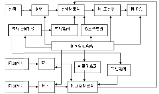 水称量斗由传感器、称量斗、气动蝶阀和信号开关组成。气动控制系统通过气动蝶阀和信号开关来控制蝶阀的开关,使称量好的附加剂和水进入搅拌机内。